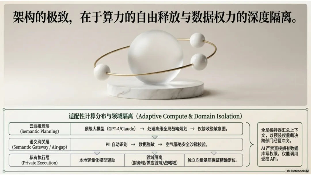 - 云端推理层(Semantic Planning):利用顶级大模型(如 Claude 3.5/GPT-4 等)处理高维语义理解和全局战略规划。此层仅接收脱敏后的意图描述,不接触底层敏感业务字段。