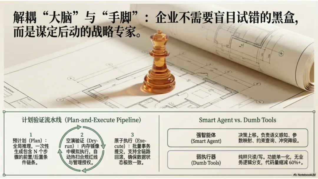 - 价值体现: 极简代码:由于移除了复杂的业务逻辑分支,底层执行器的代码量可缩减 60% 以上,极大降低了维护成本。 透明度提升:Bug 排查变得异常简单——如果是参数传错,责任在 Agent 的推理;如果是写入失败,责任在底层的物理连接。