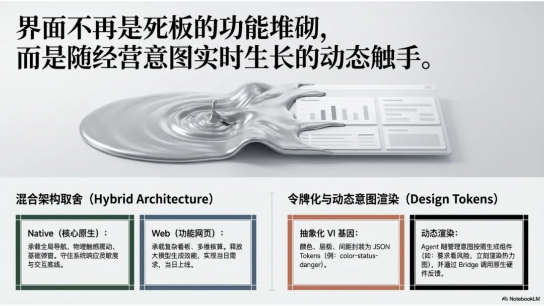 - 设计层:令牌化 UI 体系,实现意图驱动的动态界面渲染。