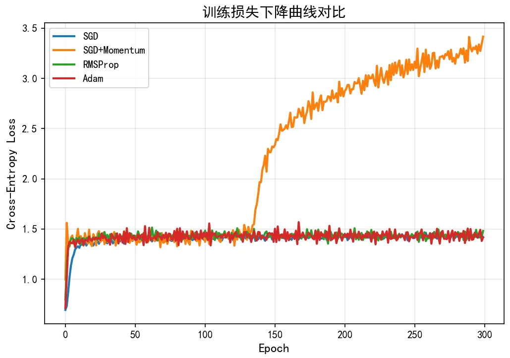 收敛速度的量化对比:以损失降至0.3为目标,Adam约需40个epoch,RMSProp约需60个epoch,SGD+Momentum约需90个epoch,而SGD在300个epoch内始终未能达到这一目标。