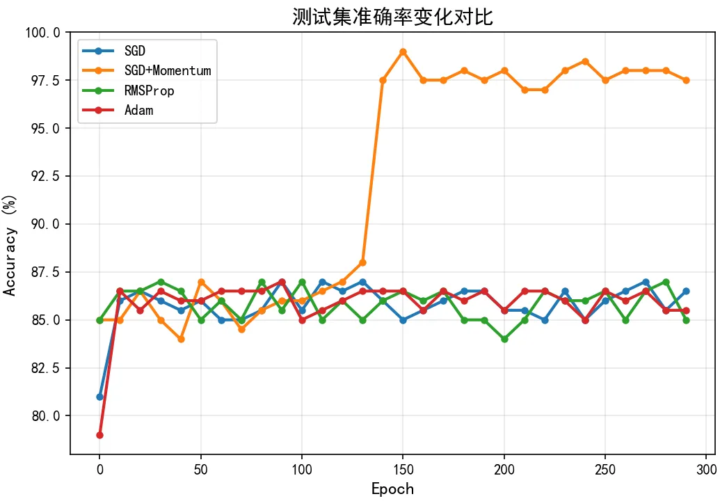 所有优化器均使用批量大小为32的mini-batch训练,共300个epoch。每个epoch后记录训练损失,每10个epoch在测试集上计算准确率。