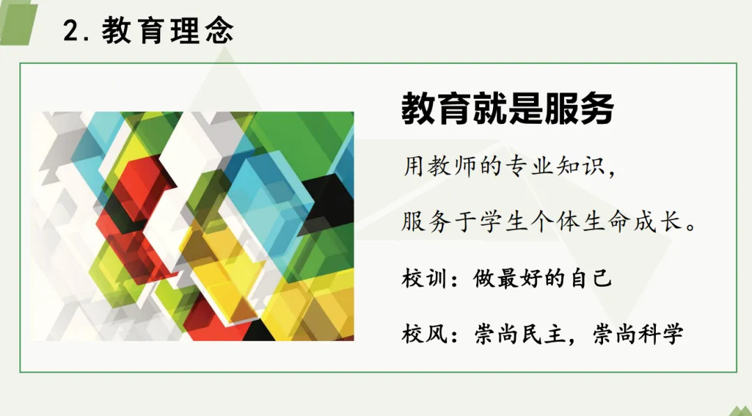 (1)核心理念:“教育就是服务”。用教师的专业知识,服务于学生个体生命成长。