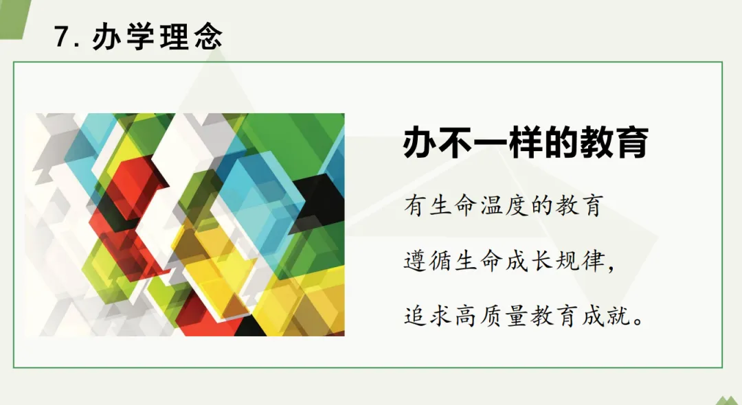 (1)核心:“办不一样的教育”、“有生命温度的教育”。