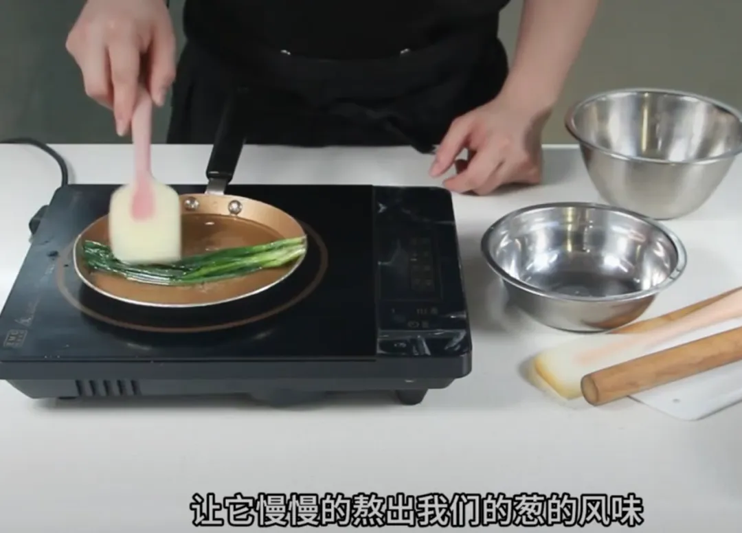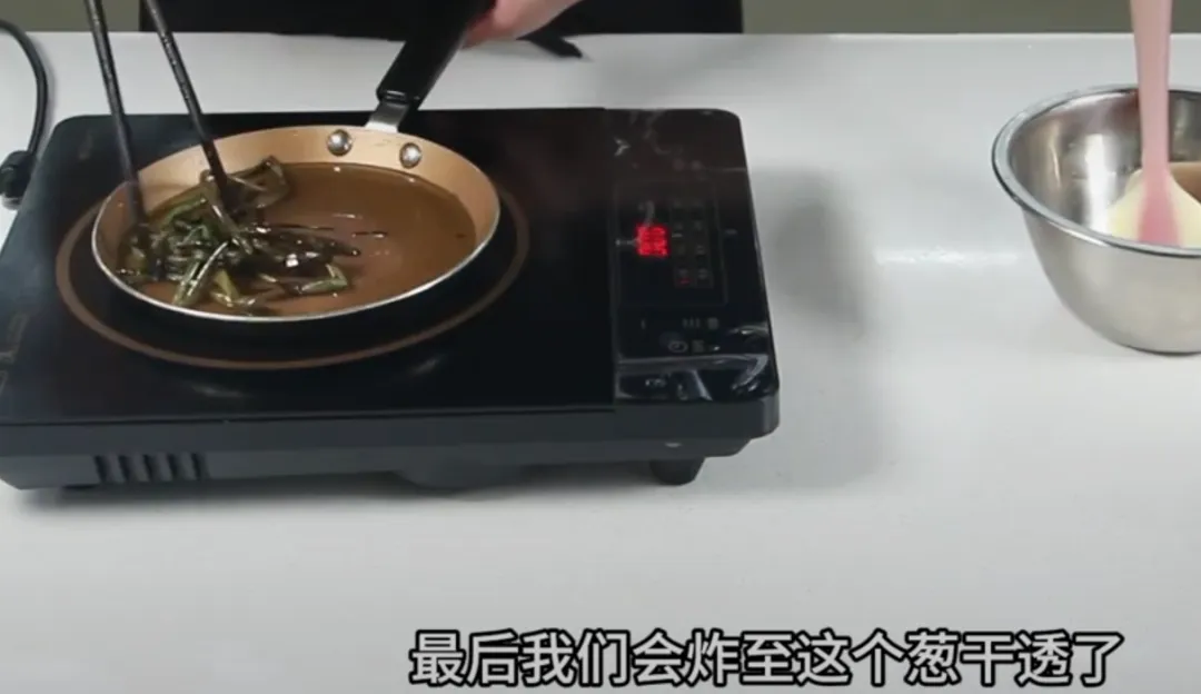 1、炸葱油:平底锅热锅下油,适当有温度的时候把葱放进去,小火慢熬,慢慢熬出葱的风味;最后把葱榨干之后把葱捞出去,不要榨糊。在这个过程如果想让葱油的风味更浓郁,可以放点八角桂皮,或者洋葱。