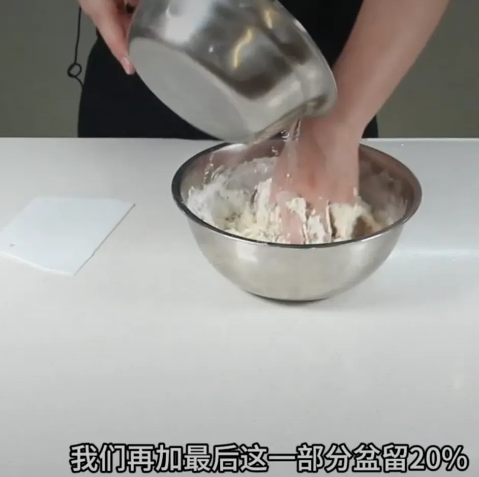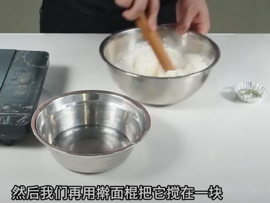 1、把盐放进低筋面粉中,把一份100克的水烧开,倒进面粉中,迅速晃动面粉盆,让水和面粉融合,再用擀面棍把他们搅拌在一起,成面絮状态。然后把另外一份100克的冷水分次倒入面粉中,用手抓匀成一个面团。