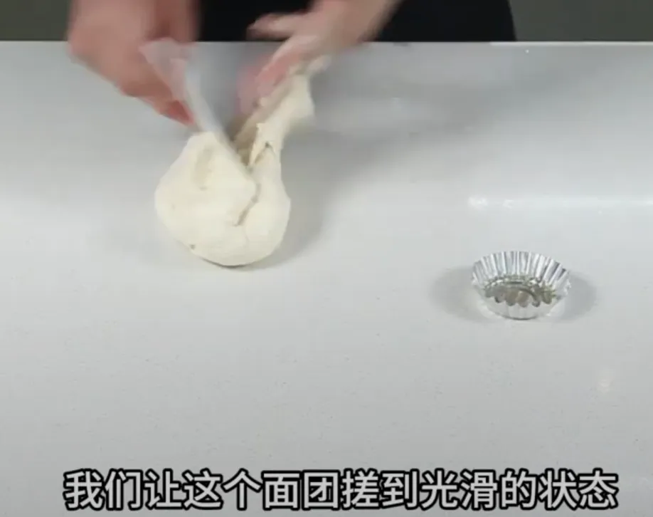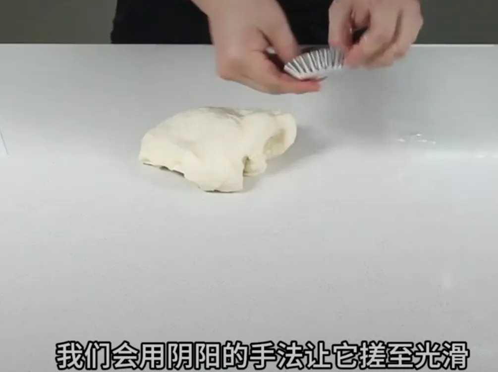 2、把面团倒在案板上,用手边搓边加入一些色拉油防粘,最后用阴阳的手法或者甩面的手法将面团搓至光滑。盖上盆醒发15分钟。