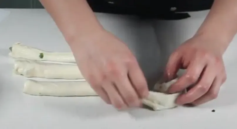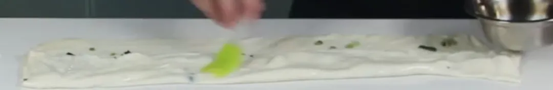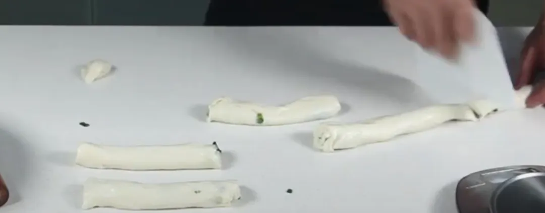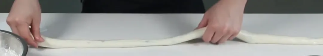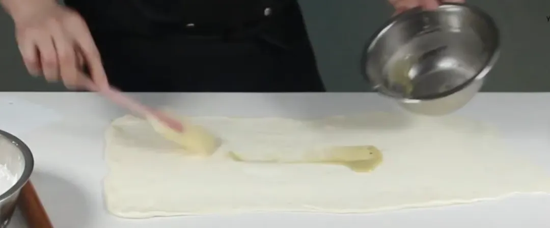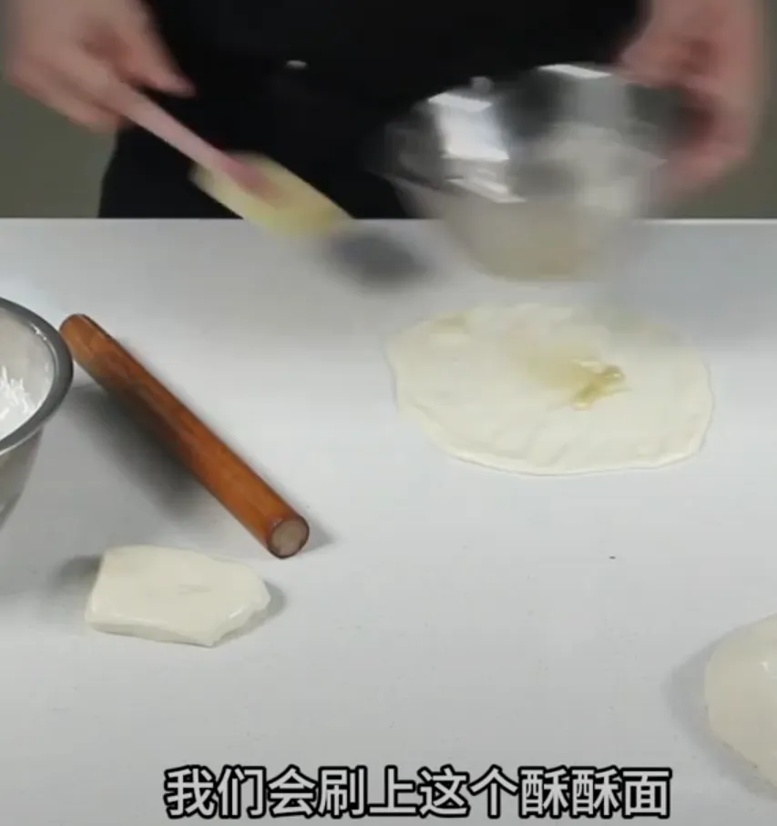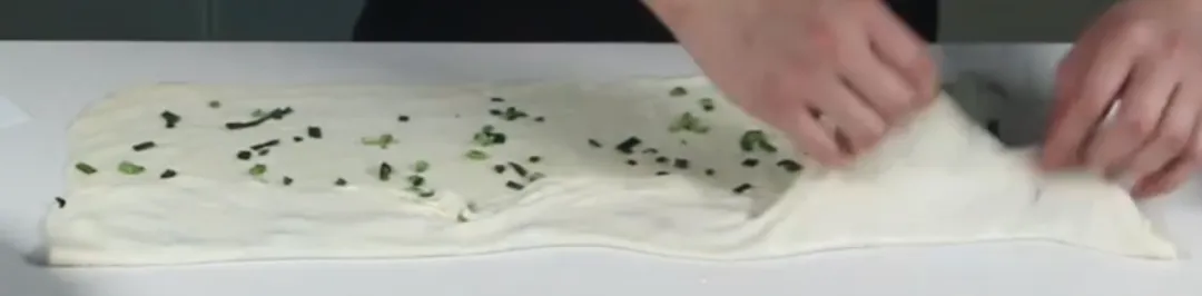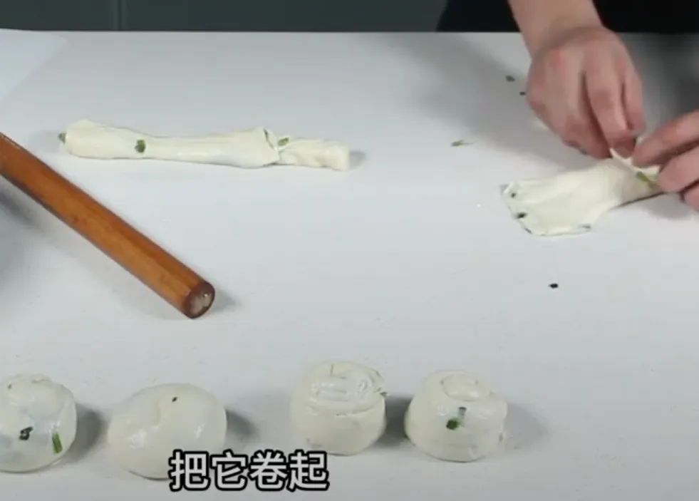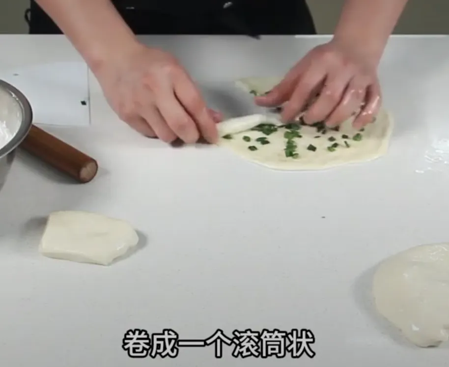 第二种是把面团擀成0.2厘米的面皮,涂抹一层酥面,铺上葱花,卷起来,卷的时候继续刷上酥油,卷紧,卷成一条,可以撑长一些,然后切成80克一个,擀长一些,再卷成一个圈(收尾的一端要压扁才能无缝衔接)。做好后松弛15分钟。