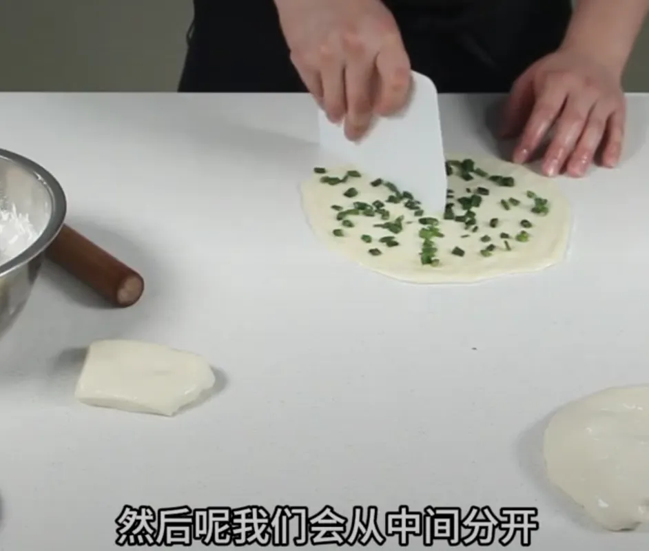 第一种是把面团分为80克一个,收圆,对角擀,擀平,刷上油酥,放上葱花,用刮板葱中间切开,卷成一个滚筒,最后压扁成一个团,刷一些油,静止15分钟。
