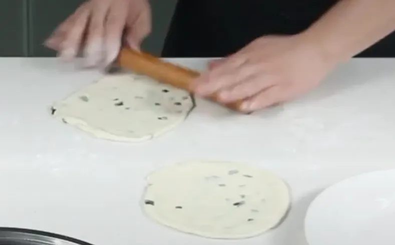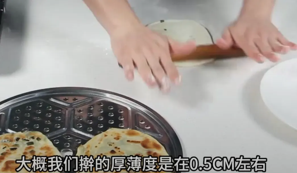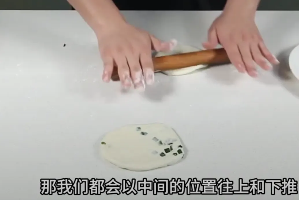 然后也是同样的手法,案板撒粉,慢慢擀薄成厚度0.5厘米的面饼,起锅烧油煎至两面金黄。