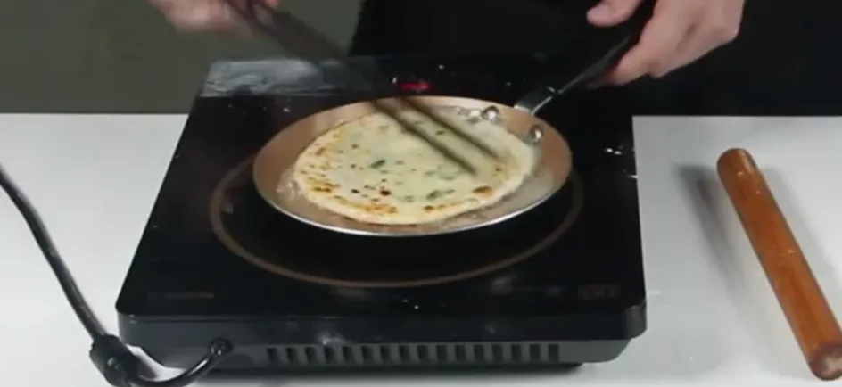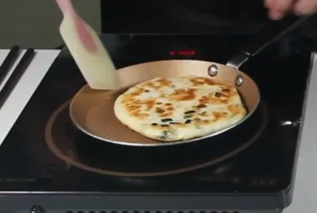 然后案板上撒一点面粉,用擀面杖把面团慢慢多次擀成扁扁的厚度0.5厘米的饼,起锅烧油,煎饼。煎的过程中为了防止表皮破裂,可以刷点油,最后煎至两面金黄,出锅。