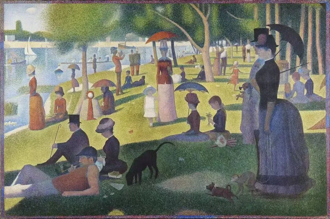 Georges Seurat 在 1884 年创作的《大碗岛的星期日下午》(A Sunday Afternoon on the Island of La Grande Jatte)几乎可以看作这种生活方式的视觉总结:阳伞、礼帽、蓬裙和整齐的草地构成一个秩序井然的周日下午场景。画面中的人物彼此靠近,却又保持距离,像一组静止的社会角色。Anderson 在谈到这幅画时说,他喜欢它的直接与普遍性——那种几乎像糖果盒般的田园景象,不需要复杂的艺术史知识,每个人都能理解。