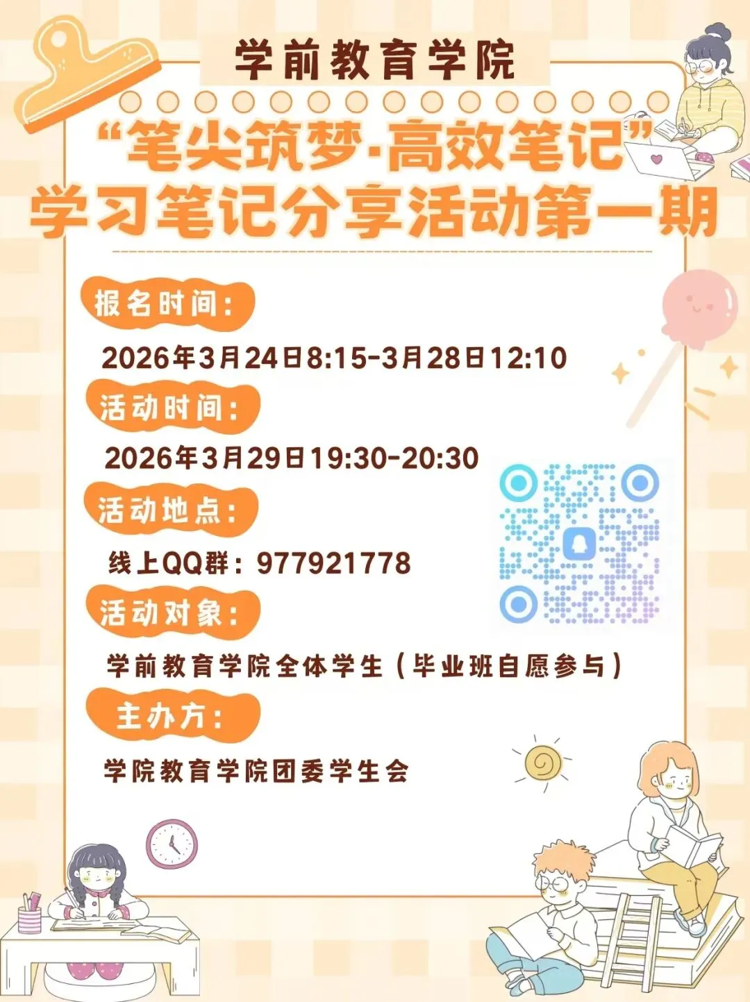 2.参与者需按要求上传笔记视频和笔记图片至活动QQ群相册(视频时长2-4分钟,视频命名为姓名+班级),笔记的内容真实原创,评选视频中笔记须符合学前教育专业课程。