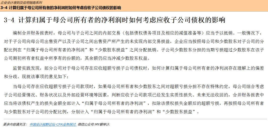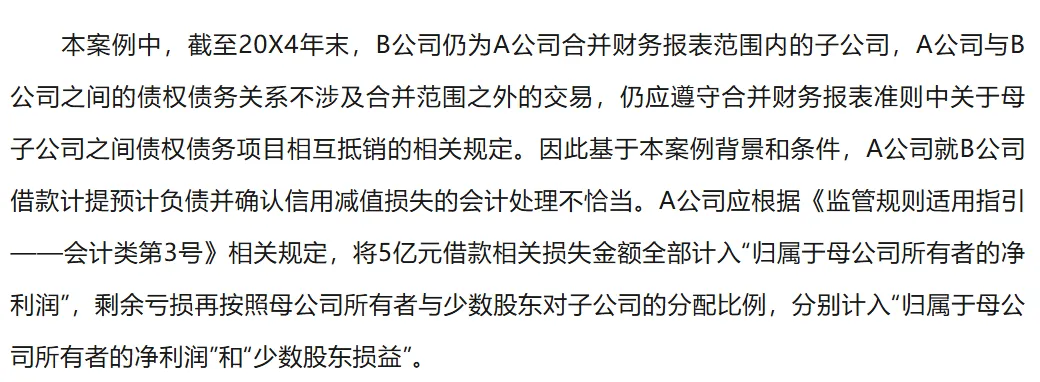 案例来源于“《监管规则适用指引——会计类第 3 号》”。3.母公司和少数股东之间对超额亏损分担没有特殊约定。注意必须同时符合上述条件,否则不能乱用《监管规则适用指引——会计类第 3 号》。这说明:由于母公司单方面提供了借款且无法收回,这相当于母公司额外承担了损失,而少数股东没有承担。也就是当子公司资不抵债且母公司单方面输血时,这笔借款更像是一笔无法收回的权益性投入。那么,在上述条件下,母公司应收子公司款项已经发生实质性损失、未来无法收回的,合并财务报表中应当将该债权产生的损失金额全部计入“归属于母公司所有者的净利润”,扣除该债权损失金额后的超额亏损,再按照母公司所有者与少数股东对子公司的分配比例,分别计入“归属于母公司所有者的净利润”和“少数股东损益”。