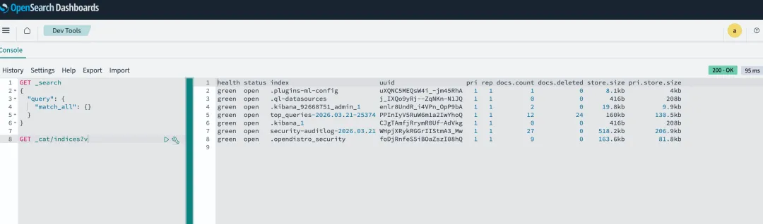 登录之后,就可以直接在Dev Tools里查看OpenSearch的状态和索引信息了。可以看到,OpenSearch默认的主分片数和副本分片数都是1,这一点和托管版OpenSearch服务的默认行为并不完全一样。