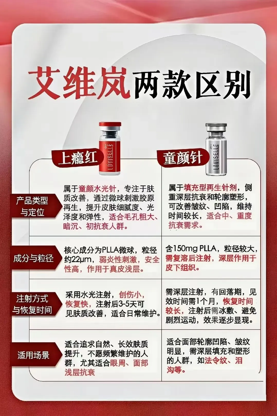 俗气的说,那还不是所花的“米”不一样。一瓶银色的童颜可以搞4-5瓶上瘾红。但是上瘾红主要成分plla的含量也只有银色童颜的1/4 。上瘾红呢,比较适合30岁以后的想要改善肤质,减少细纹,提高皮肤紧致度的人。