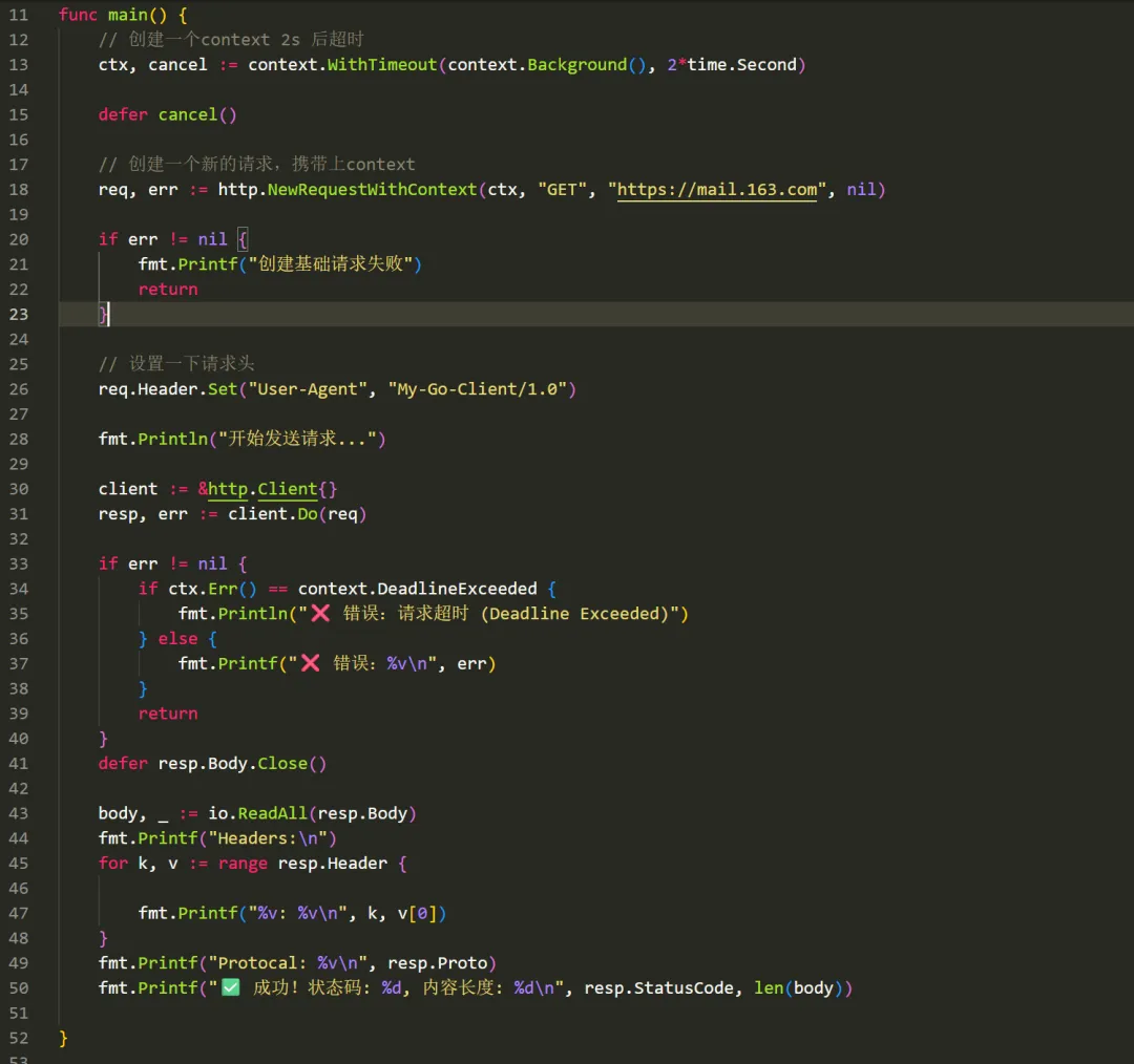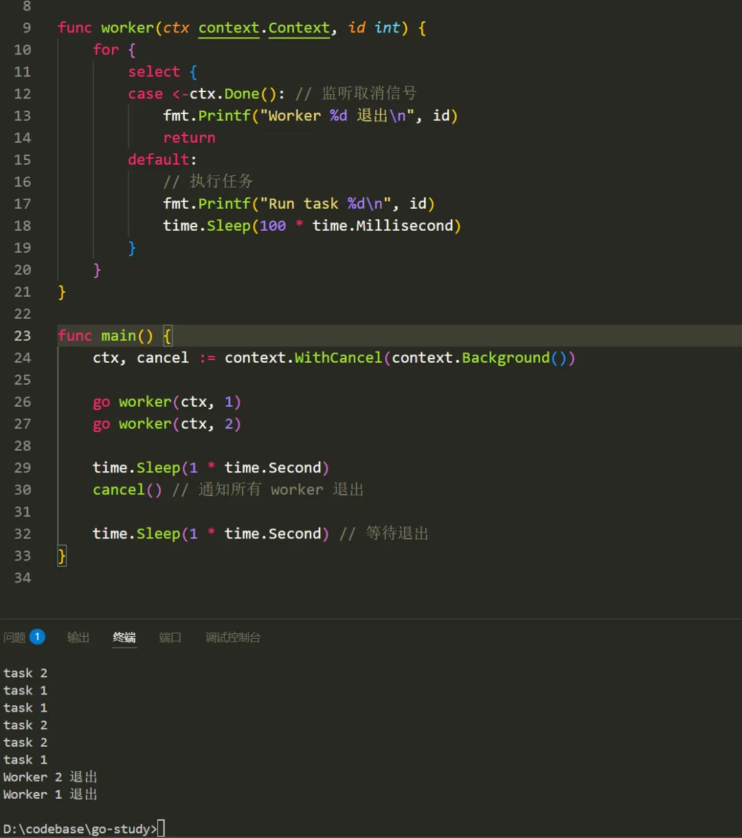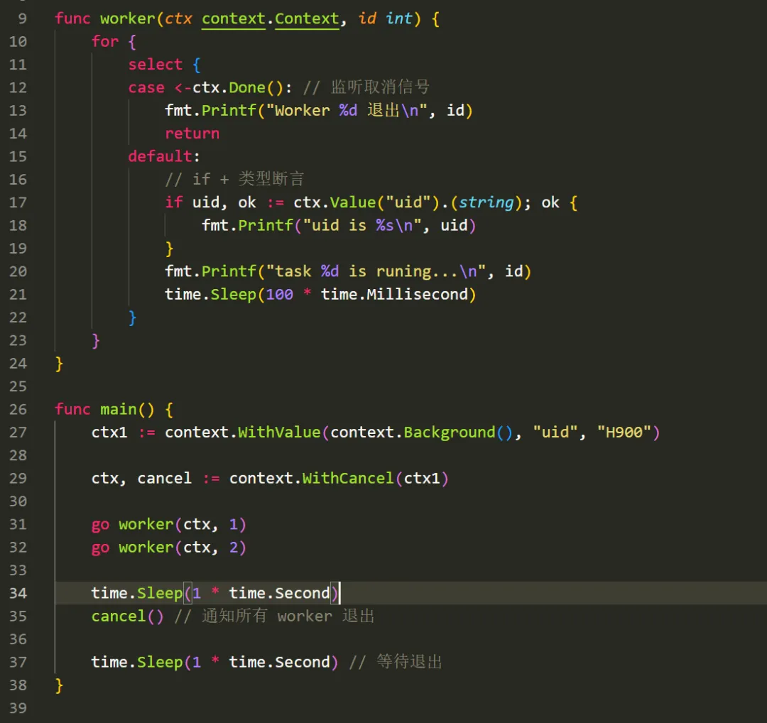 context 包是 go 1.7 是引入的,可以方便的对请求做取消和超时控制 在GoWeb 编程中,在处理浏览器请求时,通常要调用数据库,上游接口,等等, 如果请求断开,可以使用 context, 来取消一系列的动作避免资源 空转, 下图是go Context 的结构体方法type Context interface { Deadline() (deadline time.Time, ok bool) Done() <-chanstruct{} Err() error Value(key interface{}) interface{}}使用context 首先需要创建一个context ,使用context.Background()就可以,context 创建后,不可以修改,但可以派生,比如基于第一个context 再创建一个 , context.WithTimeout(ctx, 2* time.Second),这样就派生出一个 2s 后超时的context 了,把可个context 绑定在请求上,就可以实现 请求的超时控制,下面是代码:首先 需要创建一个可以取消的的 context , 这次是 context.WithCancel(), 这个Api 有两个返回值,一个是 ctx, 一个是cancel 调用cancel会给 goroutine 一个通知,其实是一个通道消息,结合之前 讲的 for ... select 语句,就可以结束 goroutine 的运行把上面的例子 稍微改一下,就可以,Api 是 context.WithValue注意这里使用了 我们上一篇讲的类型断言,因为从context 中取出的值是一个 any 类型,我们需要使用类型断言取到正确的类型1. context 创建后,不要放在结构体中,应该做为函数的第一个参数传递2. 不要用 context.WithValue 来替代函数的参数,这个值一般是用于用于请求范围的数据(如 auth token, trace ID)3. 及时调用 cancel 函数:对于 WithCancel, WithTimeout, WithDeadline 创建的 context,必须调用返回的 cancel 函数以释放内部资源(即使已经超时)。通常使用 defer cancel()。使用之前先创建,withTimeout, withDeadline withCancel来派生,withValue 要慎重, context 其实是一个 函数执行的控制器