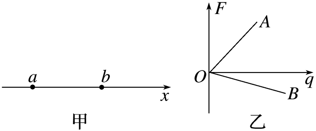 4.(2023·东莞市外国语学校高二月考)如图甲所示,x轴上有一固定的场源点电荷(未画出)及a、b两点,在a点放入带正电的试探电荷,规定电场力的正方向沿x轴正方向,得到试探电荷受到的电场力F随其电荷量q变化的图像如图乙中的A图线所示,将该试探电荷放到b点可得图乙中的B图线。关于场源点电荷的说法正确的是( )