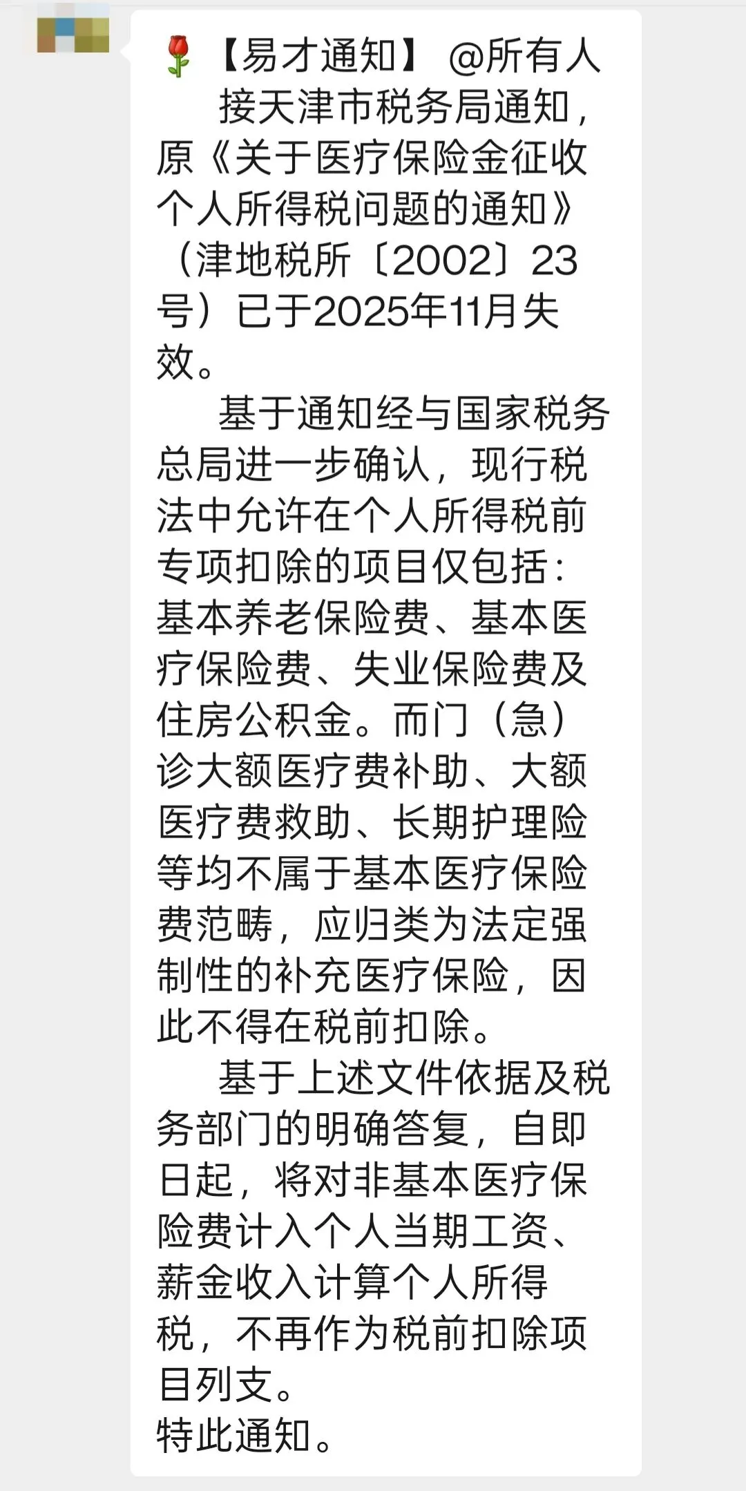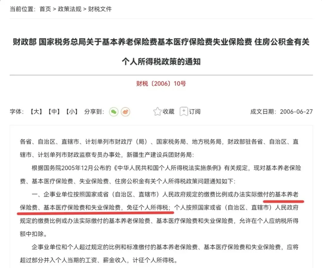 其实这个政策,也并不是天津市独有的。税务总局发布的个人所得税政策通知里,就明确指出只有基本养老保险、基本医疗保险、失业保险和住房公积金,可以免征个人所得税。