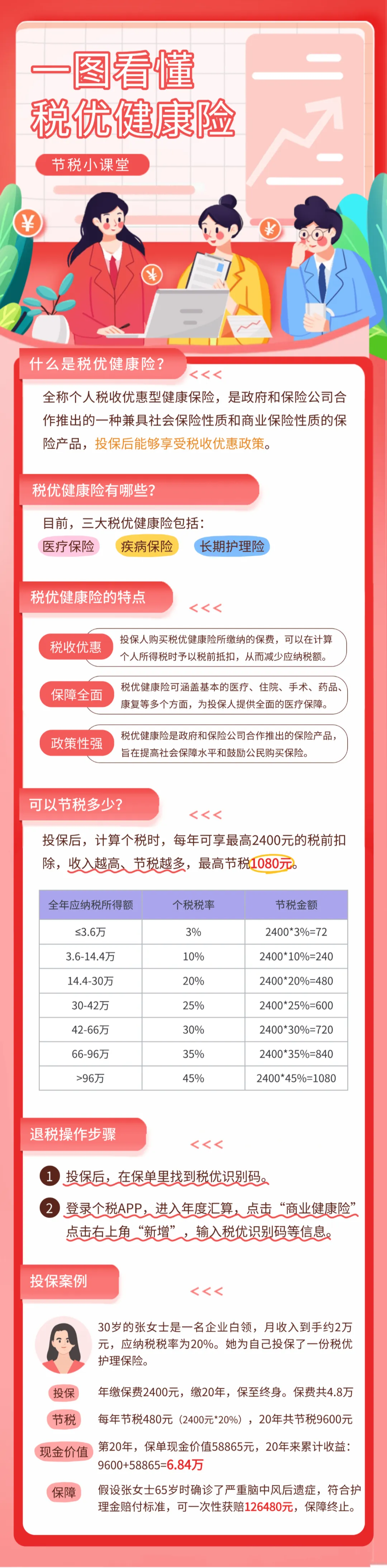 税优健康险包含医疗保险、疾病保险、长期护理险,投保人在交费期内,每年都可以按照自己适用的个人所得税税率,享受对应比例的税前扣除,交了多少年保费,就能节多少年税。