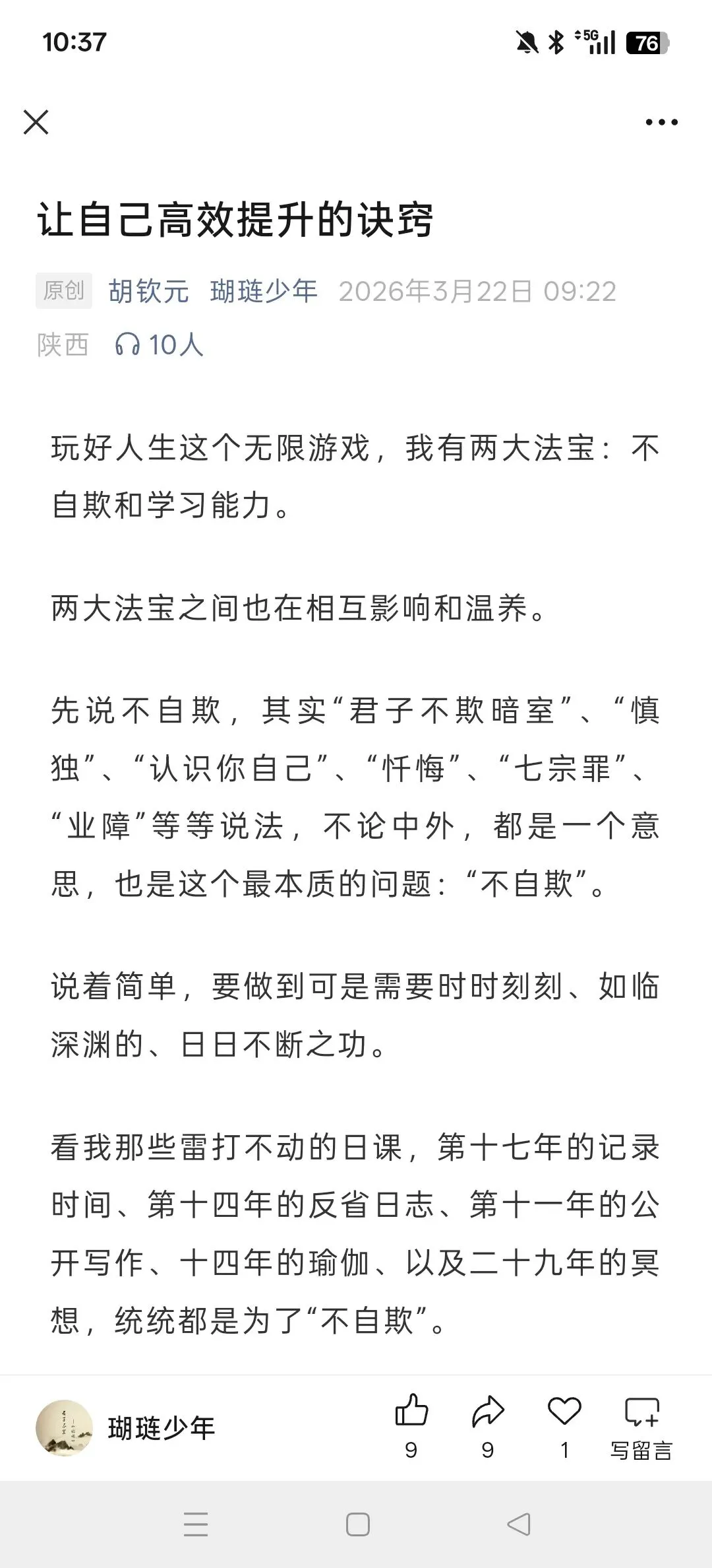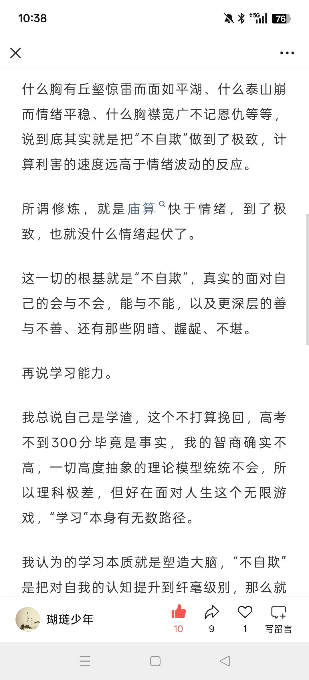 - 底层逻辑:先通过「不自欺」实现极致的自我认知,再用「学习能力」精准投入资源、迭代自我,最终在机会来临时形成竞争优势。