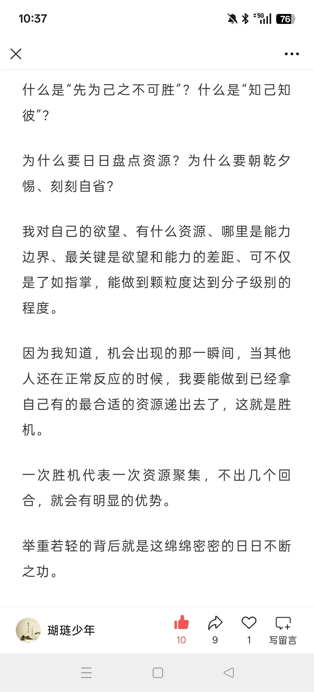 3. 外在表现:当对自我的认知足够清晰,就能在机会来临时快速匹配最优资源,形成胜机;同时,庙算(利害计算)速度远超情绪波动,表现为“胸有丘壑而面如平湖”的情绪稳定。