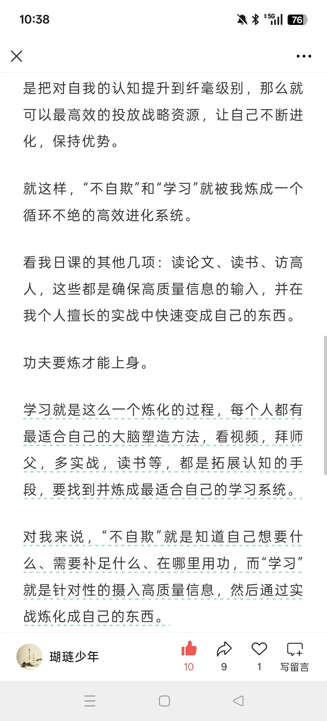 3. 与「不自欺」的联动:「不自欺」明确了“要补什么、在哪用功”,「学习」则针对性地摄入信息并实战转化,二者构成循环不绝的高效进化系统。