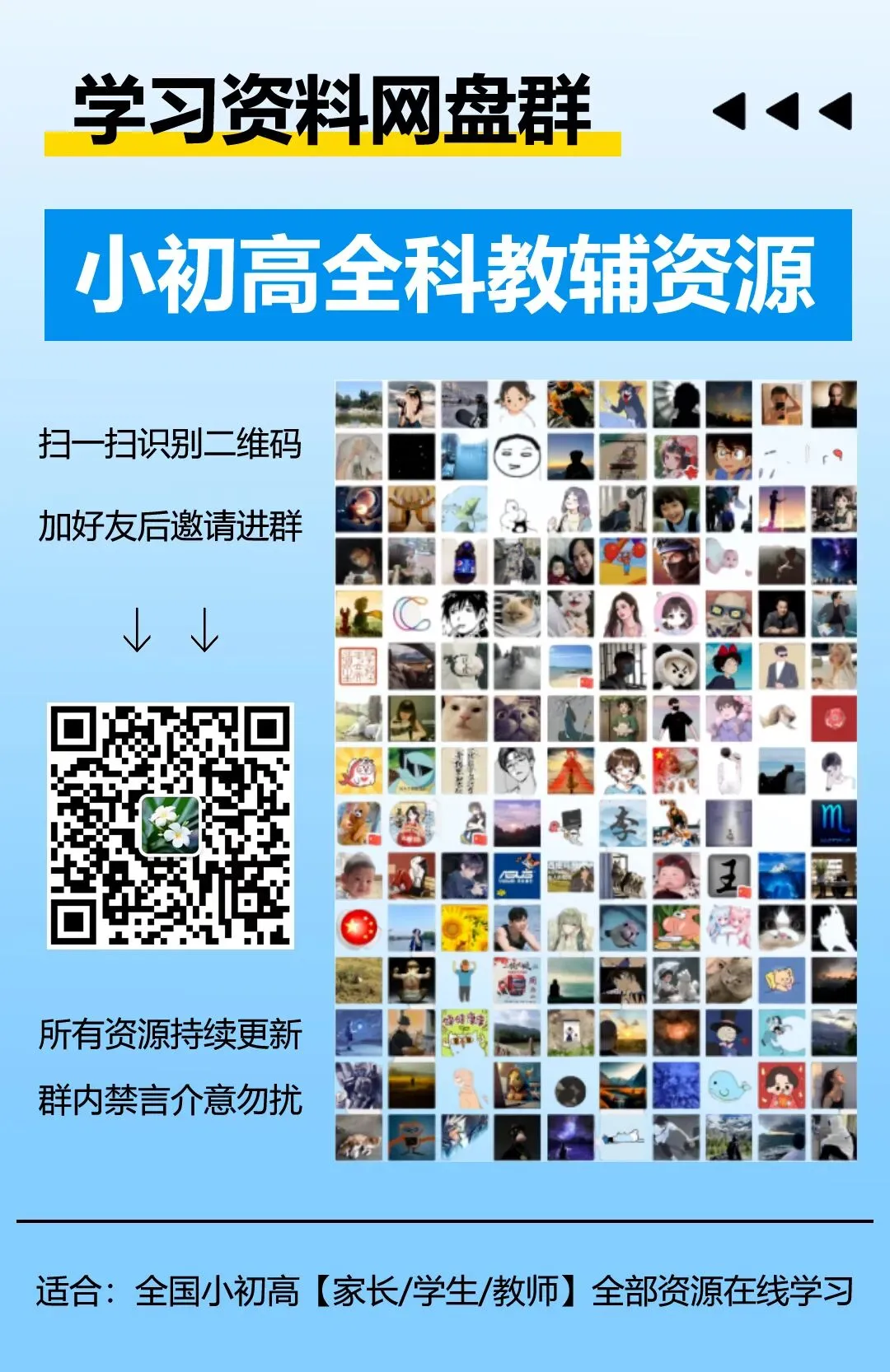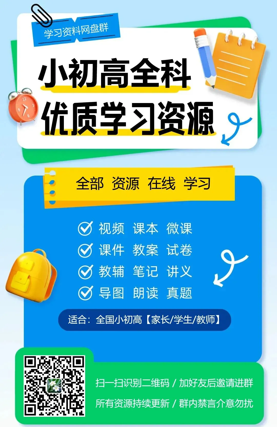 我们整理了超多教辅资源,分免费和会员两类。免费随便看,会员需购买。资源都在百度网盘里,需扫码进群查看。资源永久有效持续更新,可在线观看转存下载。可联系绿泡泡412938051进会员群。