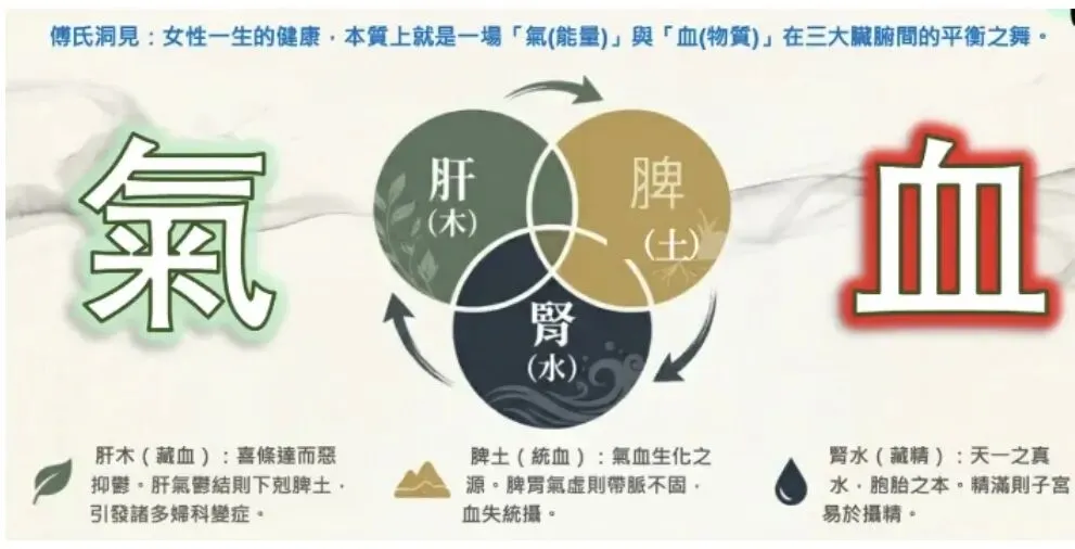 妇科在于气、血在肝、脾、肾三大脏腑之间的平衡:①肝:肝藏血,主疏泄,负责调节气血的流通与分配。肝气郁结或肝血不足,会导致气血运行不畅,引发月经不调、带下异常等问题。