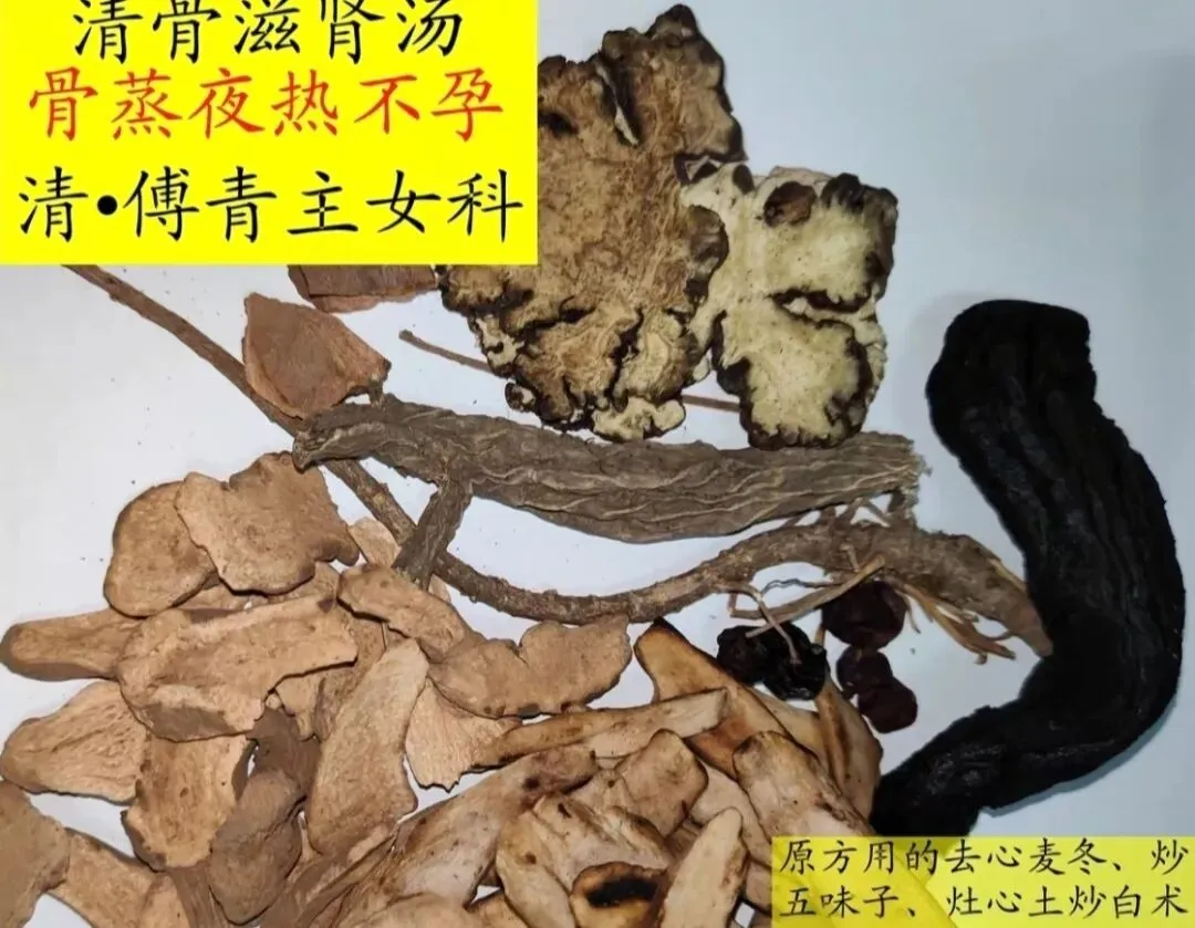 ①肾阴亏虚,骨髓内热:肾为先天之本,主骨生髓。若肾阴不足,无法滋养骨髓,导致骨髓中虚火内生,形成“骨蒸夜热”之象,表现为夜间身体发热、口干舌燥、咳嗽吐沫等症状。骨髓为胞胎所养,骨髓过热则胞胎失养,难以摄精受孕。②心肾水火不济:心属火,肾属水,正常状态下心肾水火既济,维持人体阴阳平衡。若肾阴亏虚,无法上济心阴,导致心火亢盛,心肾水火不济,进一步加重骨髓内热,影响胞胎的生理功能,使受孕困难。总结:“骨蒸夜热不受孕”主要病因是肾阴亏虚、骨髓内热及心肾水火不济,治疗需以滋肾阴、清骨髓热、交通心肾为主。3.清骨滋肾汤方原文:妇人有骨蒸夜热,遍体火焦,口干舌燥,咳嗽吐沫,难于生子者。人以为阴虚火动也,谁知是骨髓内热乎!夫寒阴之地,固不生物,而干旱之田,岂能长养。然而骨髓与胞胎何相关切,而骨髓之热,即能使人不嗣,此前贤未言者也。山一旦创言之,不几为世俗所骇乎?而要知不必骇也,此中实有其理焉。盖胞胎,为五脏外之一脏耳。以其不阴不阳,所以不列于五脏之中。所谓不阴不阳者,以胞胎上系于心包,下系于命门。系心包者通于心,心者,阳也;系命门者通于肾,肾者,阴也。是阴之中有阳,阳之中有阴,所以通于变化,或生男或生女,俱从此出。然必阴阳协和,不偏不枯,始能变化生人,否则否矣。况胞胎既通于肾,而骨髓亦肾之所化也。骨髓热,由于肾之热,肾热而胞胎亦不能不热。且胞胎非骨髓之养,则婴儿无以生骨。骨髓过热,则骨中空虚,惟存火烈之气,又何能成胎?治法必须清骨中之热,然骨热由于水亏,必补肾之阴,则骨热除,珠露有滴濡之喜矣。壮水之主,以制阳光,此之谓也。方用清骨滋肾汤。一般先连服三十剂以缓解骨蒸夜热症状,再继续服用六十剂,通常可促进受孕。功效:补肾精、清骨热,通过滋阴清热、敛汗固精,调节肾阴不足、骨蒸内热之证,改善因阴虚火旺导致的不孕、口干舌燥、咳嗽吐沫等症状。声明:传播此文只是为了弘扬中医药文化,让更多人了解学习中医药知识之目的。非商用。图.文来自网络,如有侵犯了您的权益,请留言与我们联系,删除,谢谢。如有错误地方敬请老师们留言指正!