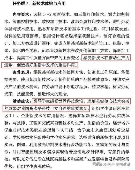 5.“感受新技术在生产、生活中发挥的重要作用,体悟劳动人民创造新技术的智慧”变为“感受新技术在推动生产力进步、创造美好生活中发挥的重要作用”,并在活动建议中增加“引导学生感受世界科技前沿,理解关键核心技术突破的成果对我国高水平科技自立自强的重要意义。”的表述
