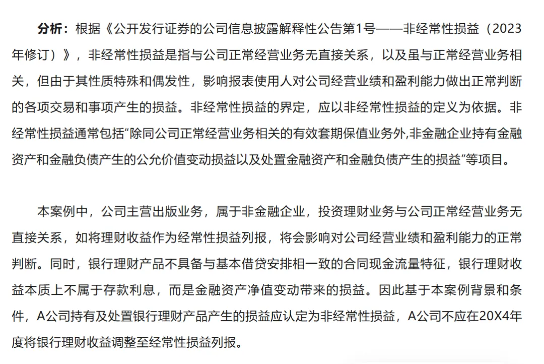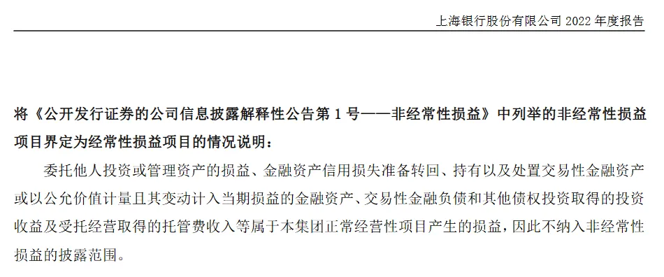 需要注意的是,该案例的公司主体是非金融企业(主营业务为图书出版),如果是金融企业,比如商业银行持有或处置银行理财产品产生的损益则应作为经常性损益,因为这是商业银行的日常经营业务,所以不会列报为非经常性损益。详见上海银行2022年度报告: