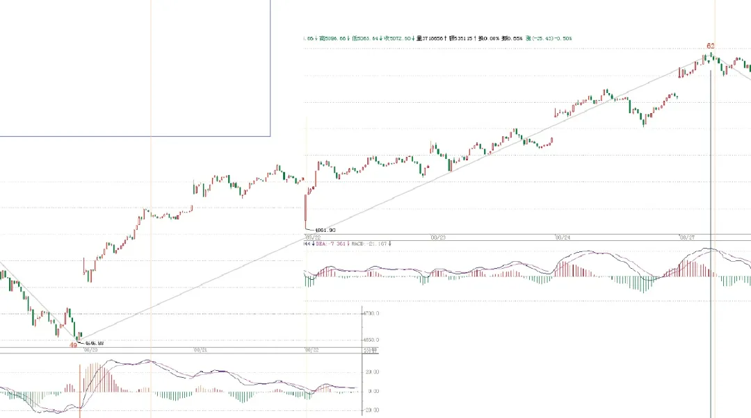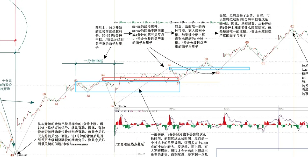 图中两个蓝色中枢区间不重合,但是有红色的波动区间重合,按照这个定理就是已经形成大级别的中枢了。但是你在五分钟上却看不出来明显中枢形态,看图: