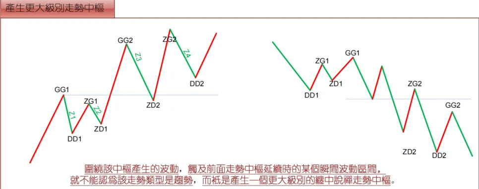 缠中说禅走势中枢中心定理二前后同级别的两个缠中说禅走势中枢,后GG<前DD等价于下跌及其延续;后DD>前GG等价于上涨及其延续。后ZG<前ZD且后GG>=前DD,或后ZD>前ZG且后DD=<前GG,则等价于形成高级别的走势中枢
