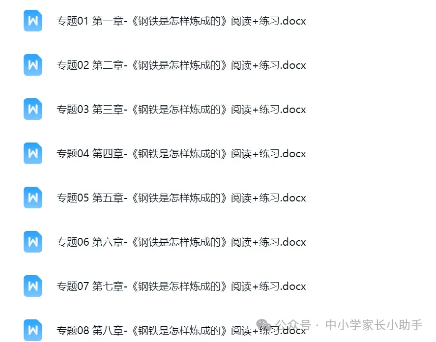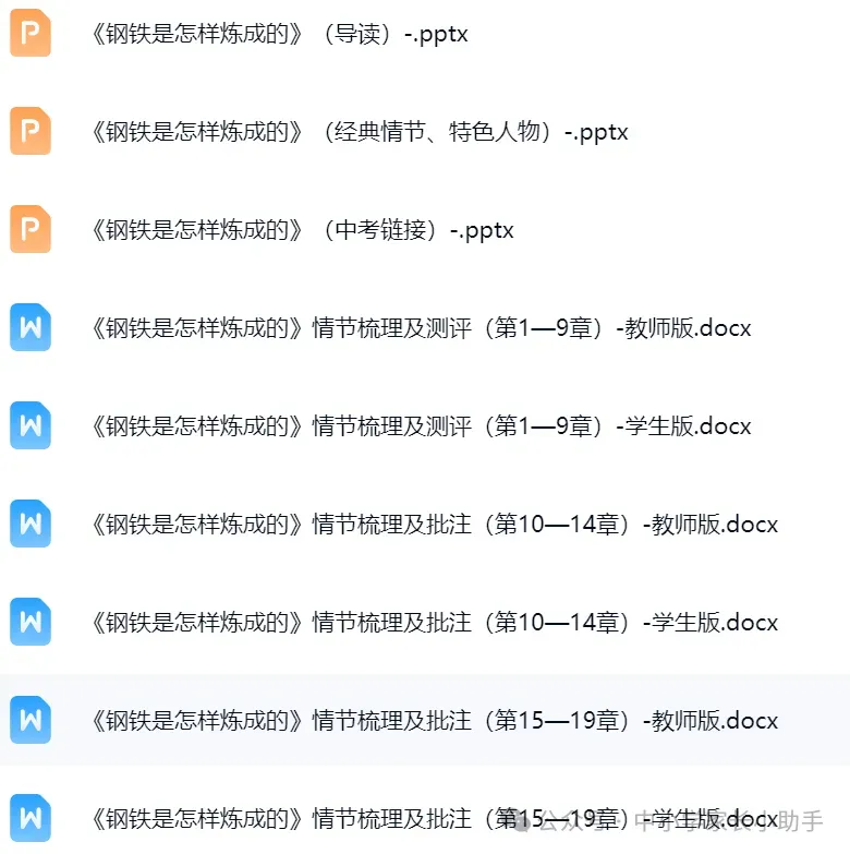 通过百度网盘分享的文件:《钢铁是怎样炼成的》阅读导引+思维导图+内容概括+原文批注+阅读训练(word)