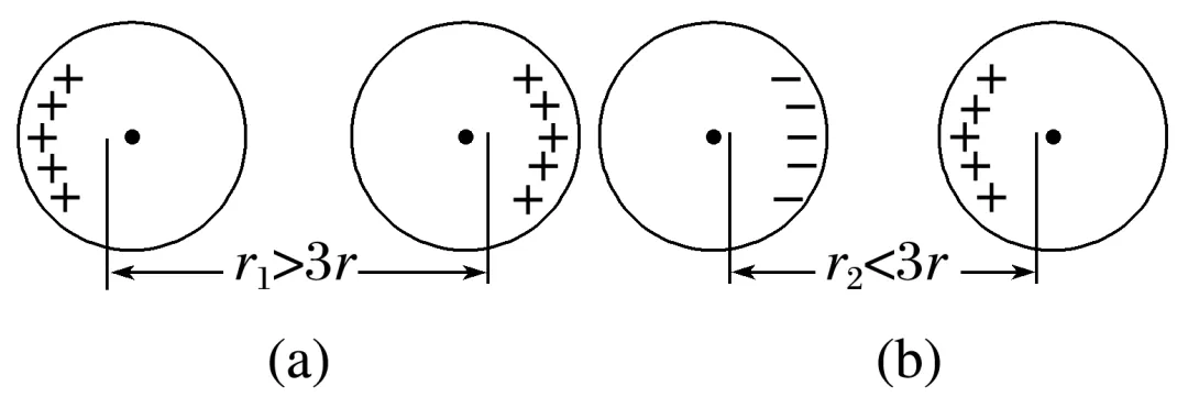 2.两个规则的带电球体相距比较近时,不能看作点电荷,此时必须考虑电荷在球体上的实际分布。若带同种电荷时,如图(a),由于同种电荷排斥,电荷分布于最远的两侧,电荷中心距离大于3r,此时F<kq29r2;若带异种电荷时,如图(b),由于异种电荷吸引,电荷分布于最近的两侧,电荷中心距离小于3r,此时F>kq29r2。