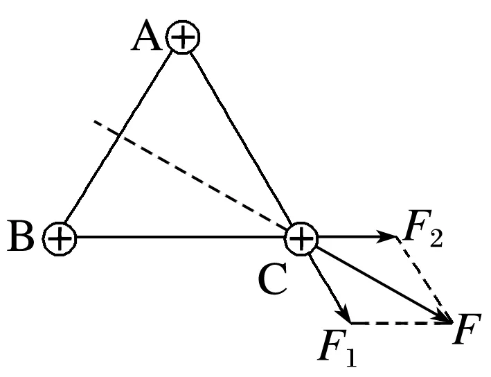 以C为研究对象,根据库仑定律,点电荷C共受到F1和F2两个静电力的作用,如图所示,每两个点电荷之间的距离都相同,故F1=F2=kQ2a2,根据平行四边形定则,合力为F=2F1cos 30°=3kQ2a2,合力的方向沿A与B连线的垂直平分线斜向右下方。