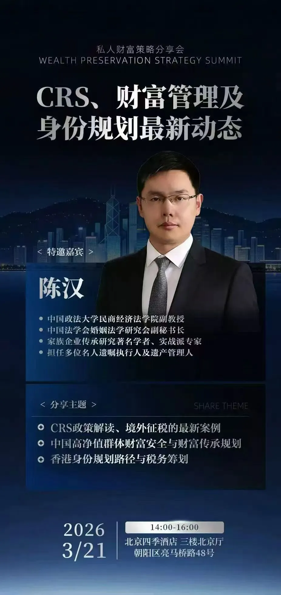 周日我们团队在北京四季酒店,邀请来自中国政法大学陈汉教授,进行了名为“CRS、财富管理及身份规划最新动态”的私人财富策略分享会,200席位坐满了人。