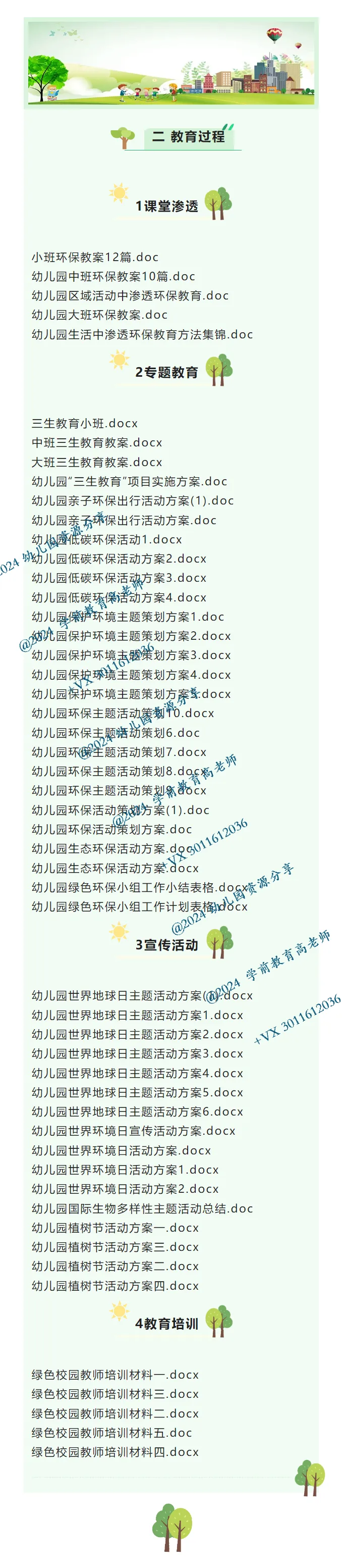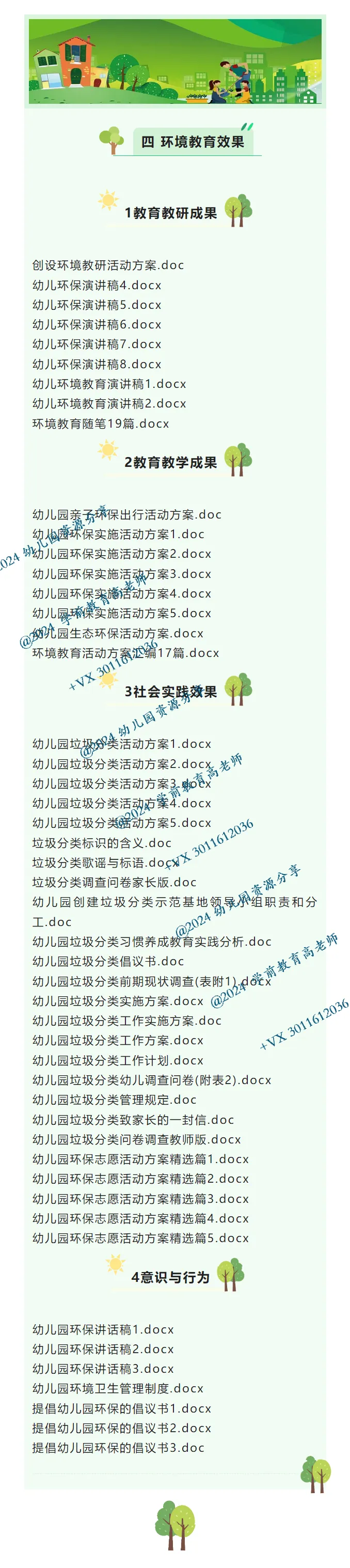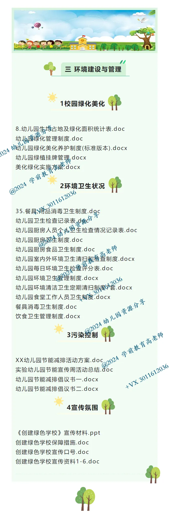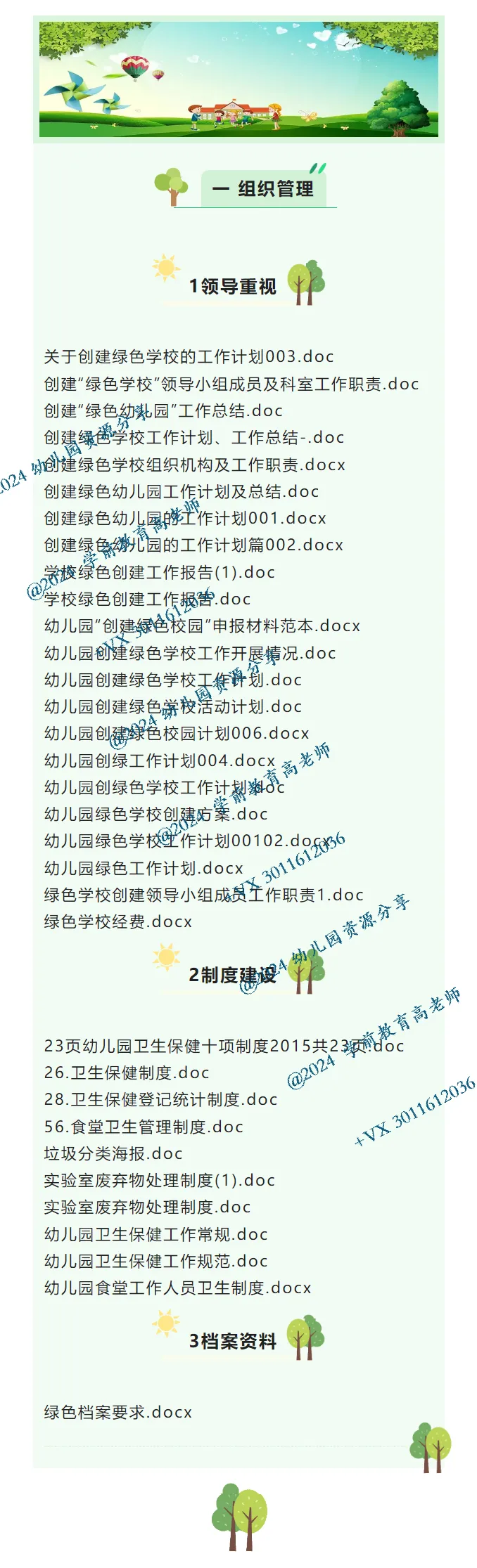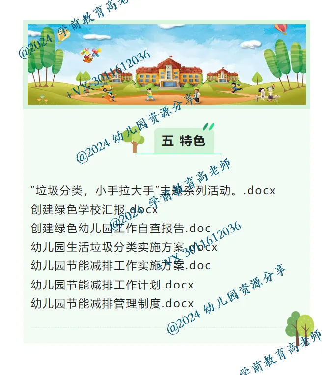 本套资料根据幼儿园创建绿色校园评估细则全新整理,分组织管理——教育过程——环境建设与管理——环境教育效果——特色五大版块,16个观测点,167个文档,非常细致。对于幼儿园的创绿校园有很好指导作用。@+VX 3011612036 希望各幼儿园在创绿工作方面一切顺利!