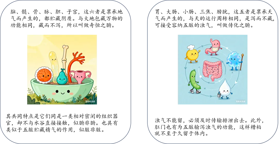 •传化之腑:包括胃、大肠、小肠、三焦、膀胱,像天一样,动、阳、疏通、不息,只传化与排泄,不储藏,它们接受五脏代谢后的 “浊气”(废物、糟粕),东西不能久留,必须转运、排泄出去。