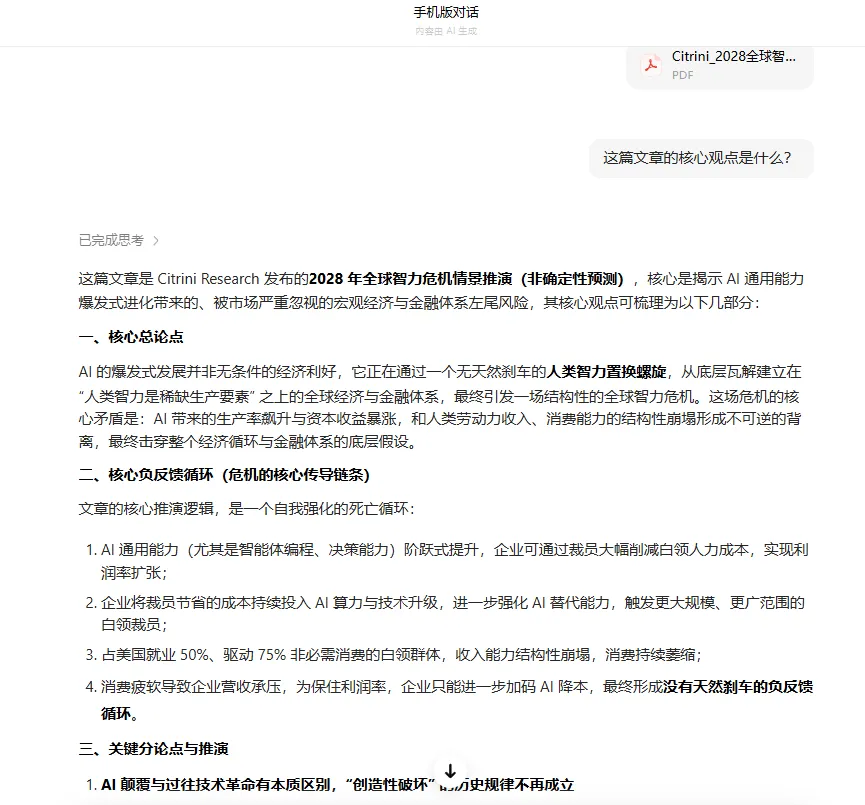 把之前那篇关于“全球智力危机”的笔记丢给它,问:“这篇文章的核心观点是什么?”