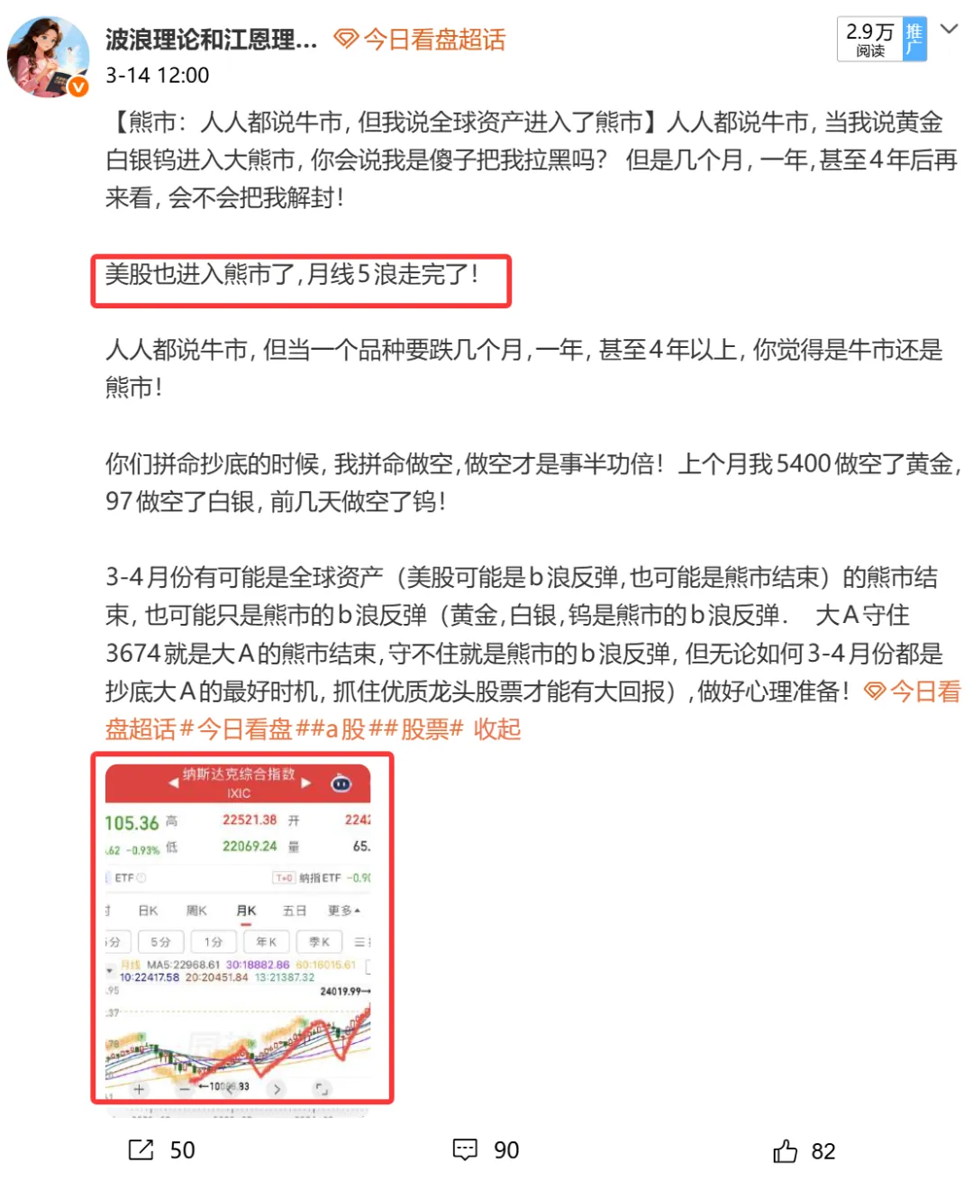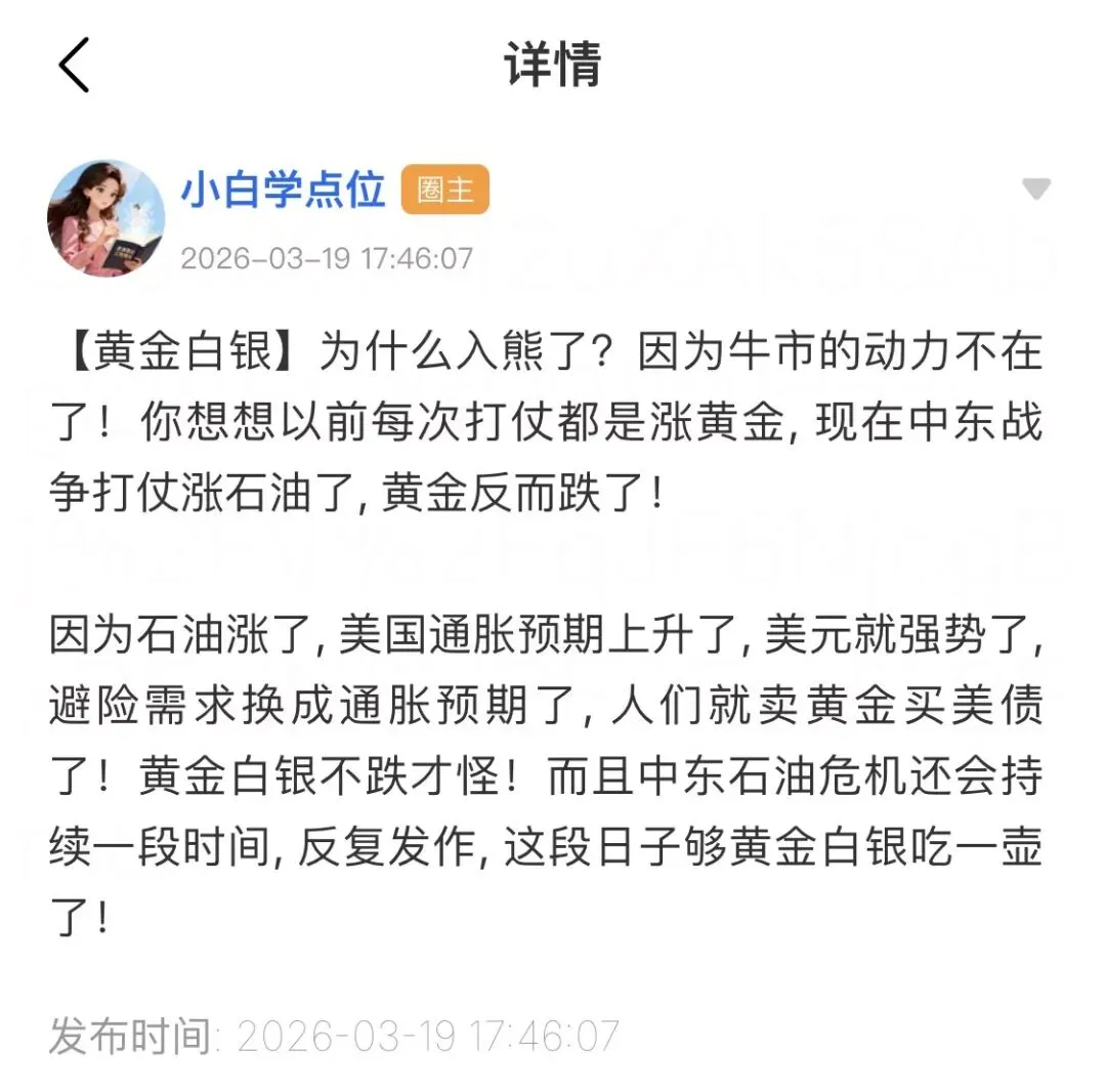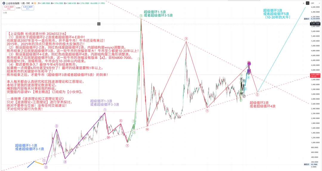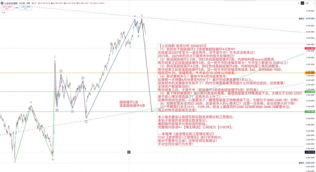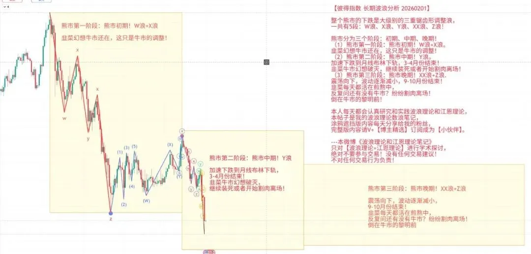 一、你还在幻想牛市的时候, 我早早识别出熊市并落袋和暴揍了!我真搞不明白,市场都明显走坏了,咋就没人提醒大家呢?还有人一个劲鼓励你们,说什么韧性十足、趋势向好。信这些你可就栽了,我都提醒第无数次了。今天是3月23日,我再跟大家说一次,赶紧躲。最近这几个消息,个个都是红灯预警。(1)【彼得指数】去年9月份利用4年周期预测了10月6日是牛市的顶点!去年10月5日-10月7日再次跟大家强调【彼得指数牛熊转换图】,再次确认10月6日就是牛市顶点!在很多韭菜幻想再创新高的时候, 2025年10月6日一天不差成为了牛市最峰顶, 熊市正式到来!我也在12.0000-12.5000, 47.00和49.50, 250 暴揍了【彼得指数】、【乙态指数】和【索罗指数】!2月1日我把【彼得指数】的熊市分为三个阶段:熊市初期、熊市中期、熊市晚期!2月5日我的【彼得指数】长线分析图过去一个半月了, 至今依然按照我的预测运行!(2)【大不落金】、【大不落银】1月底提醒在5378、118.2附近出现峰顶, 实际在5600附近出现峰顶.2月底我预测要上升到次高峰顶5400和97, 上升会在3月开盘当天再次出现峰顶. 3月2日在很多韭菜幻想6000的时候. 【大不落金】、【大不落银】出现了次高峰顶。我在5400暴揍了【大不落金】,97暴揍了【大不落银】!【大不落金】、【大不落银】的熊市确认到来!(3)【大爱】2月24日我分析说外围环境恶化,不容乐观!大家降低预期!需要减cang跑路, 等3-4月份黄金坑!2月26日年初八当天再次提醒落袋!大爱很多鱼虾蟹从年初八一直下降到现在!周五失守4000,熊市中期确立!从波浪理论角度看来, 大爱2024年9月份开始的那一波牛市其实不是牛市, 而是熊市中的极大上升。真正的牛市是从这次黄金坑开始!这次黄金坑才是10年长牛的开端!目前处于超级循环2-Z浪或者超级循环4-E浪中! 具体后面章节会有分析!