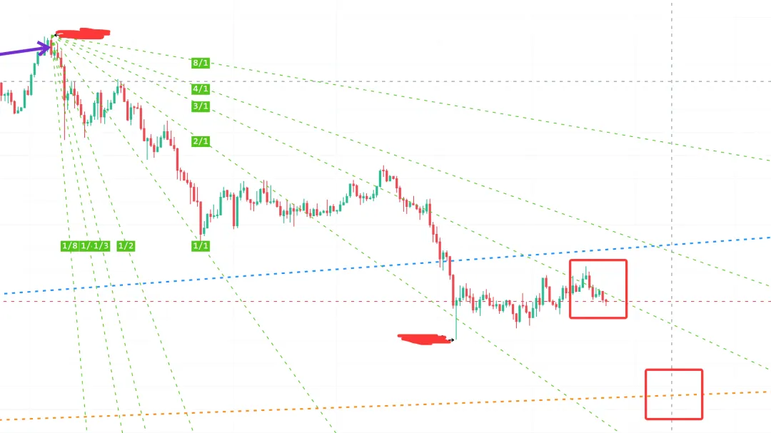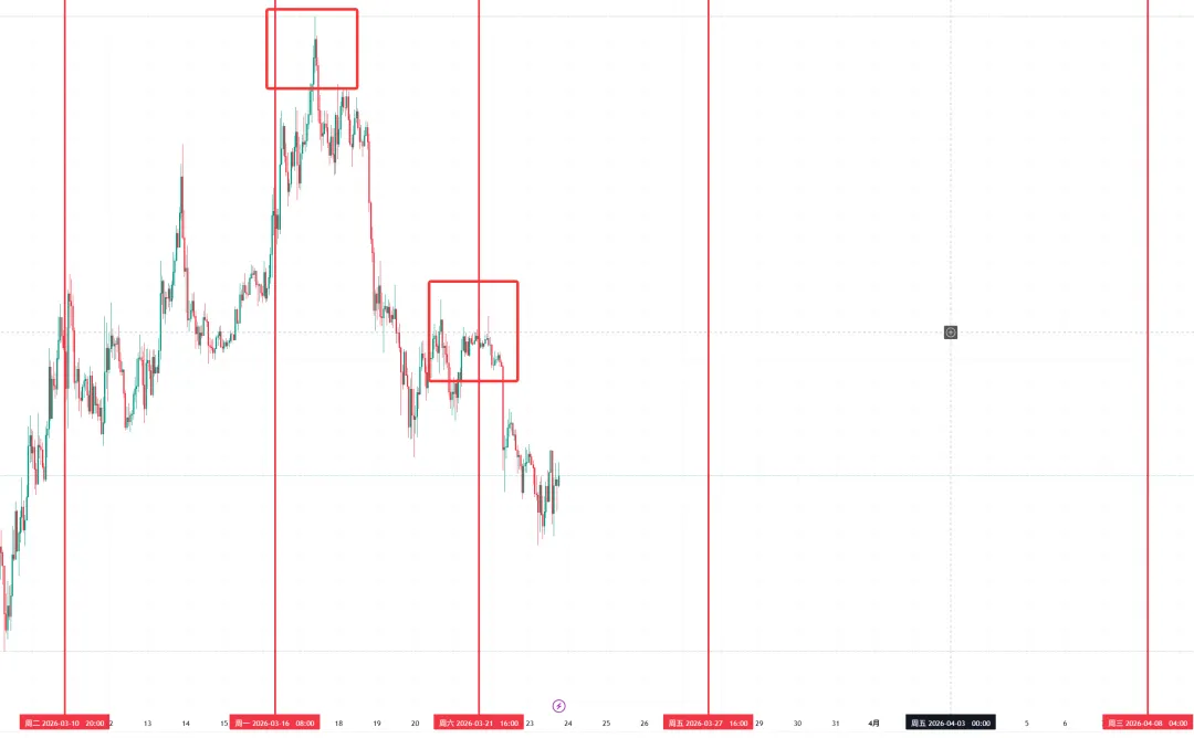 我们以2025年10月6日历史最高点位起点,10月11日低点为参考点,绘制最新的【江恩时间序列】。重要变盘时间节点2026年1月19日、2026年3月10日已经得到验证!说江恩理论无用的没有良心!接下来的重要变盘时间节点在2026年3月26日和2026年4月12日。我们以2025年10月7日历史最高点位起点,2025年11月21日最低点为参考点, 绘制最新的【江恩箱】。重要变盘时间节点2026年1月15日、2026年2月9日、2026年2月24日、2026年3月4日、2026年3月16日、2026年3月21日已经得到验证!说江恩理论无用的没有良心!接下来的重要变盘时间节点在2026年3月27日、2026年4月8日。后续我们可以通过江恩角度线和波浪理论、威科夫模型或者缠论对其进一步筛选,过滤一些不重要的变盘节点,并判断是高点还是低点。