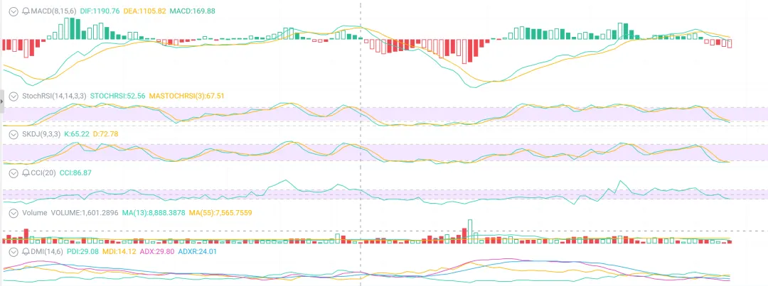 磨吧磨!一条预警都没有,前面几轮熊市可是密集预警了很多很多次!说明这里离真正的大抵抗还早!日级macd(8 15 6)连续4天死叉了,日级stochrsi和日级skdj继续死叉向下且到了20以下!完全到峰顶的可能性非常大。这里需要连续3天有效跌破日线kc下轨来确认完全到达峰顶!日级Volume需要一个放量下降,才算到阶段性大抵抗!