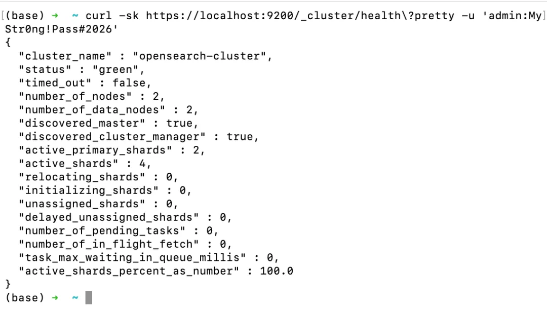 kubectl port-forward svc/opensearch-cluster-master 9200:9200 &curl -sk https://localhost:9200/_cluster/health\?pretty -u 'admin:<your-password>'