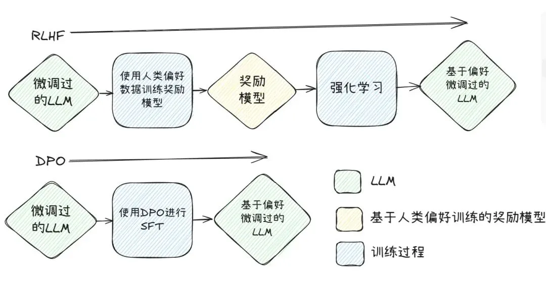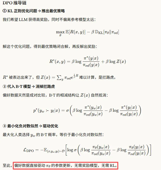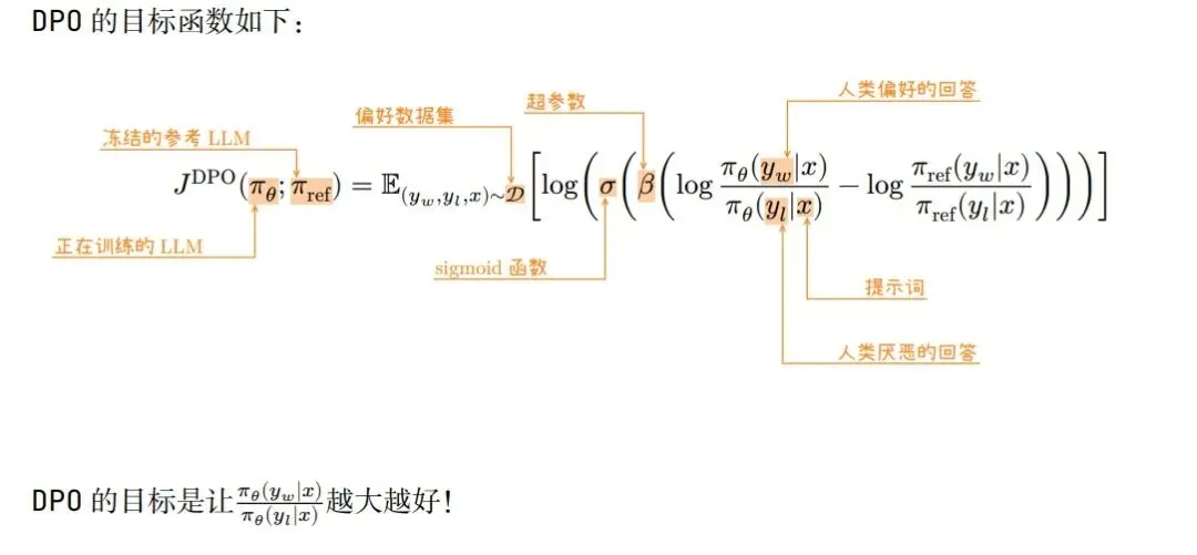 DPO(Direct Preference Optimization,直接偏好优化)算法虽然归类于RLHF,但是却没有奖励模型和强化学习。
