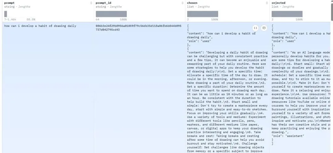 数据集中chosen列为偏好回答,rejected列为非偏好回答。