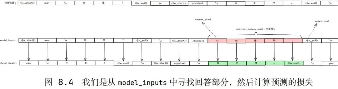 即从数据集中先找到模型的回答部分(即assistant部分)再计算损失,因为只有模型回答部分是学习目标。