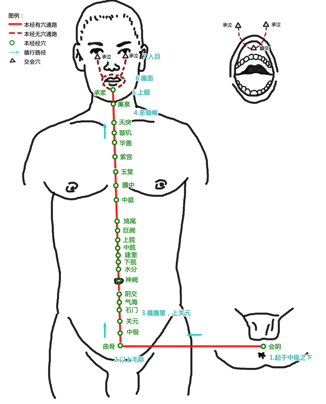 《素问·骨空论》:任脉者,起于中极之下,以上毛际,循腹里,上关元,至咽喉,上颐,循面入目。