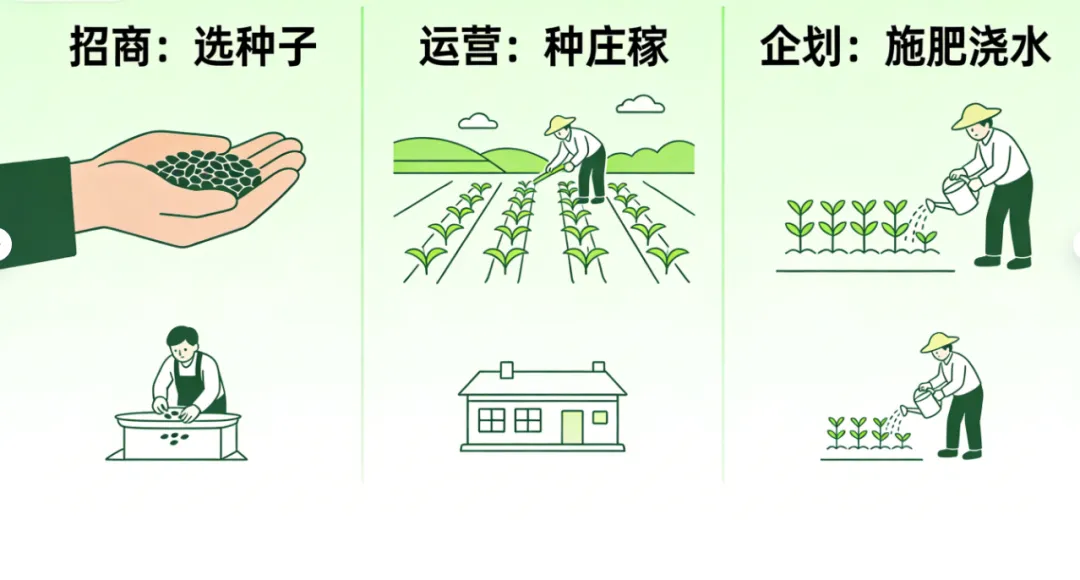 数据同源:大家看着同一张报表(销售、客流、客诉),得出同样的结论。目标同向:考核指标互锁。招商的奖金里有一部分取决于“新店的存活率”(运营指标);企划的奖金里有一部分取决于“活动带来的商户销售增量”(运营/招商指标);运营的奖金里有一部分取决于“空铺去化速度”(招商指标)。招商在签合同的时候,就已经替运营想好了怎么管,替企划想好了怎么推。运营在日常巡场的时候,就是在替招商考察品牌生命力,替企划收集营销素材。企划在做方案的时候,就是在替招商展示商场价值,替运营创造销售机会。在日常经营中,招商是“选种子”,运营是“种庄稼”,企划是“施肥浇水”。深度协作就是:选种子的人懂农活,种庄稼的人懂气象,施肥的人懂土壤。三者融为一体,才能长出好庄稼(高销售额)。