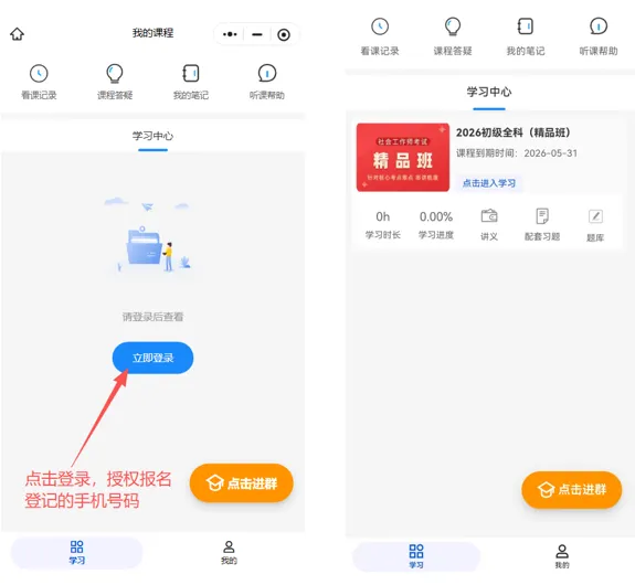 收到审核通过短信后,使用微信扫一扫,扫描下方二维码进入学习平台,使用申请时填写的手机号码登录,进入到课程页面,点击“进入学习”即可进行线上学习。
